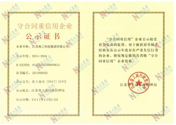 2015-2016年度江蘇省守合同重信用企業(yè)公示證書(shū)
