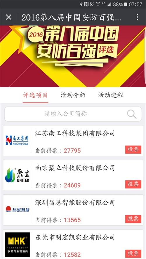2016年10月10日,2016第八屆中國安防百強網絡評選從2016年9月24日開始至10月10日正式結束,集團榮獲網絡評選第一名,獲得總票數為27795票。
