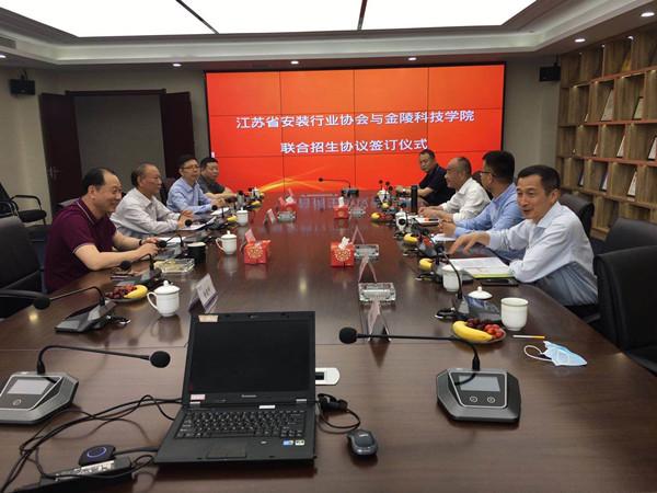 2020年5月11日,江蘇省安裝行業(yè)協(xié)會與金陵科技學(xué)院繼續(xù)教育學(xué)院在江蘇南工科技集團(tuán)有限公司進(jìn)行校協(xié)聯(lián)合招生協(xié)議簽字儀式。參加儀式的有金陵科技學(xué)院繼續(xù)教育學(xué)院院長邢紅飛、副院長吳學(xué)松;金陵科技學(xué)院機(jī)電學(xué)院院長鞠全勇,樓宇系主任牟福元,辦公室主任張玉,項(xiàng)目負(fù)責(zé)人姜玉東。江蘇省安裝行業(yè)協(xié)會駐會副會長鄒金林、副會長陳曉、秘書長吳輝、副秘書長席天陽,江蘇省安裝行業(yè)協(xié)會智能化與消防工程分會副會長、江蘇南工科技集團(tuán)有限公司執(zhí)行董事陳俊樺,分會副秘書長余晶等。