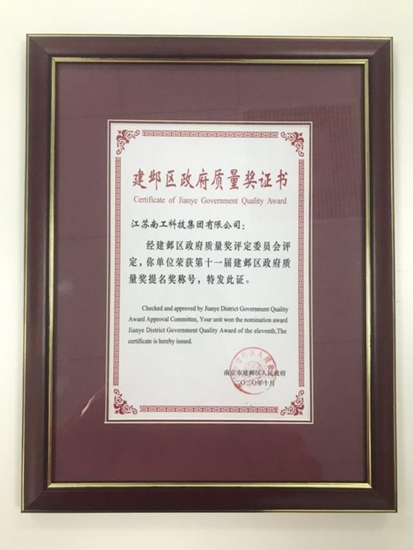 建鄴區(qū)政府質(zhì)量獎(jiǎng)證書