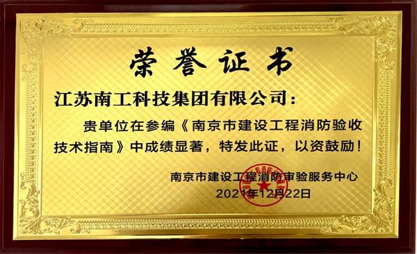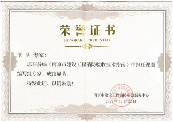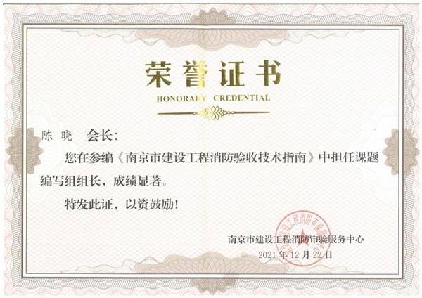 陳曉總經(jīng)理作為編寫組組長、宋慧作為編寫組專家受到了南京市建設(shè)工程消防審驗(yàn)服務(wù)中心、江蘇省安裝行業(yè)協(xié)會等一致好評,并獲得榮譽(yù)證書。