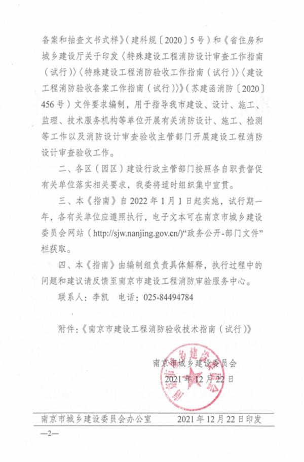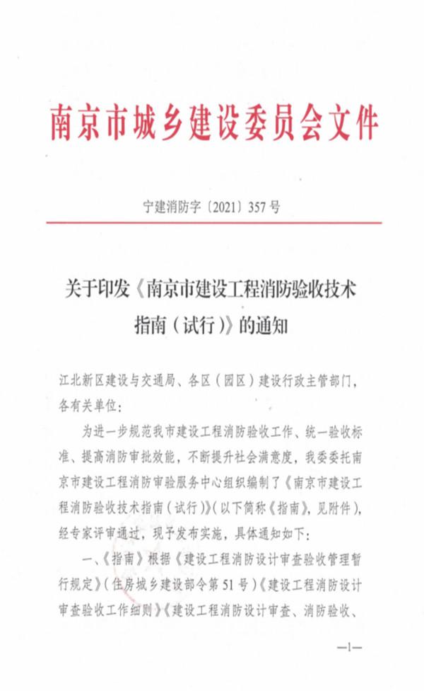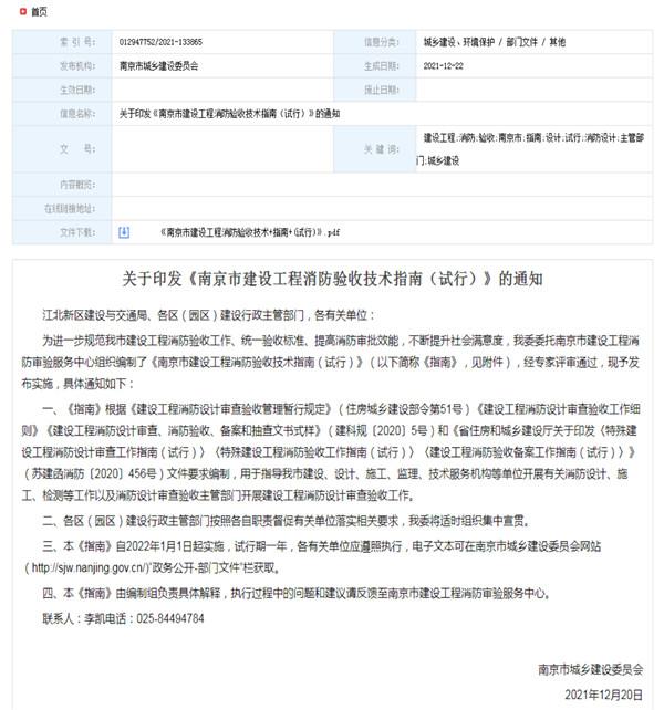 12月22日,南京市城鄉(xiāng)建設(shè)委員會正式發(fā)布《南京市建設(shè)工程消防驗(yàn)收技術(shù)指南》,從2022年1月1日起開始試行。