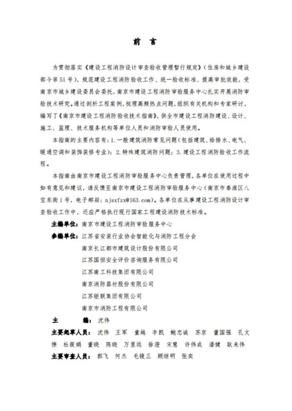 《南京市建設(shè)工程消防驗(yàn)收技術(shù)指南》的編寫是為了貫徹落實(shí)《建設(shè)工程消防設(shè)計審查驗(yàn)收管理暫行規(guī)定》(住房和城鄉(xiāng)建設(shè)部令第 51 號),提高消防工程設(shè)計審查驗(yàn)收質(zhì)量,助力消防驗(yàn)收,供全市建設(shè)工程消防建設(shè)、設(shè)計、施工、監(jiān)理等責(zé)任主體人員和消防審驗(yàn)人員使用。