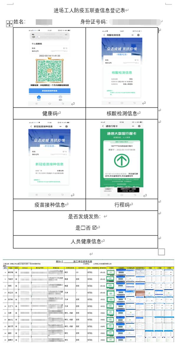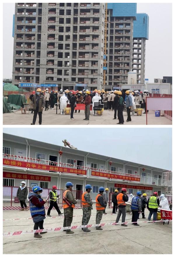 嚴(yán)格落實(shí)疫情防控要求,新入場(chǎng)人員一人一檔,一三七三次核算檢測(cè)結(jié)果陰性方可從臨時(shí)觀察區(qū)轉(zhuǎn)入集體宿舍,方可進(jìn)入工地施工。建筑工人實(shí)名制通道處和生活區(qū)分別設(shè)立體溫監(jiān)測(cè)點(diǎn),對(duì)所有施工現(xiàn)場(chǎng)人員進(jìn)行體溫檢測(cè)和“健康碼”查驗(yàn),核對(duì)人員身份和健康狀況。