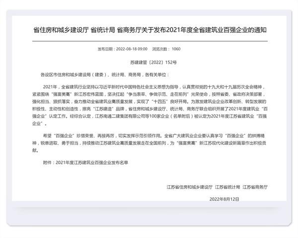 2022年8月18日,江蘇省住房和城鄉(xiāng)建設(shè)廳、江蘇省統(tǒng)計(jì)局、江蘇省商務(wù)廳發(fā)布了2021年度江蘇省建筑業(yè)百強(qiáng)企業(yè)的通知,江蘇南工科技集團(tuán)有限公司榮獲2021年度江蘇省建筑業(yè)“百強(qiáng)企業(yè)”稱號。