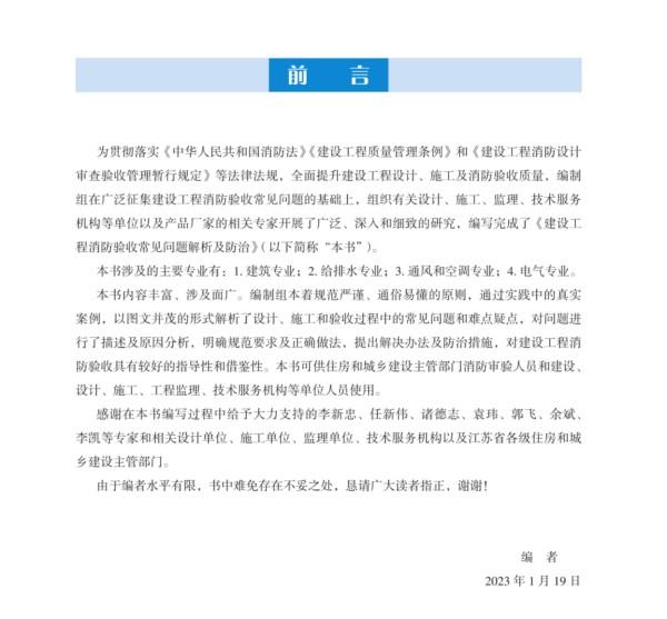 為貫徹落實(shí)《中華人民共和國消防法》《建設(shè)工程質(zhì)量管理條例》和《建設(shè)工程消防設(shè)計審查驗(yàn)收管理暫行規(guī)定》等法律法規(guī),全面提升建設(shè)工程設(shè)計、施工及消防驗(yàn)收質(zhì)量,編制組結(jié)合最新的《建筑防火通用規(guī)范》GB 55037—2022、《消防設(shè)施通用規(guī)范》GB 55036—2022等標(biāo)準(zhǔn)規(guī)范,在廣泛征集建設(shè)工程消防驗(yàn)收常見問題的基礎(chǔ)上,組織有關(guān)設(shè)計、施工、監(jiān)理、技術(shù)服務(wù)機(jī)構(gòu)等單位以及產(chǎn)品廠家的相關(guān)專家開展了廣泛、深入和細(xì)致的研究,編寫完成了《建設(shè)工程消防驗(yàn)收常見問題解析及防治》(以下簡稱“本書”)。