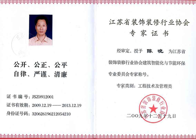 江蘇省裝飾裝修行業(yè)協(xié)會專家證書(陳曉)