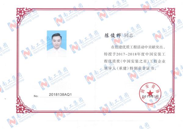 您的位置:集團(tuán)首頁(yè) >> 走進(jìn)南工 >> 企業(yè)榮譽(yù) >> 個(gè)人榮譽(yù) >> 2018年中國(guó)之星工程優(yōu)質(zhì)獎(jiǎng)企業(yè)領(lǐng)導(dǎo)人榮譽(yù)證書-陳俊樺