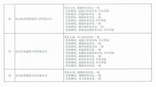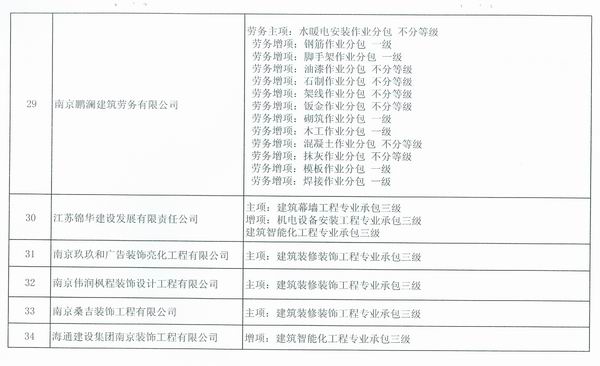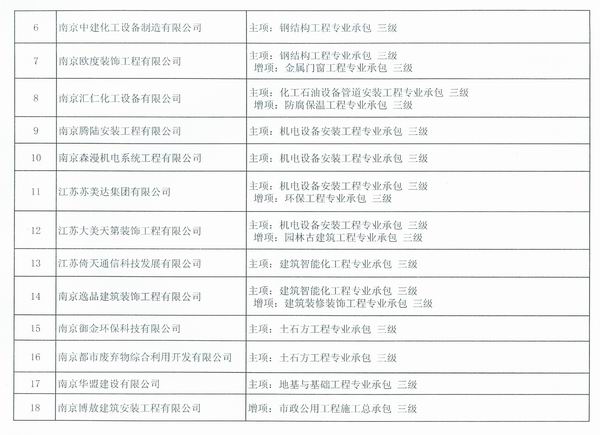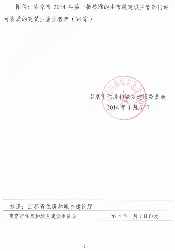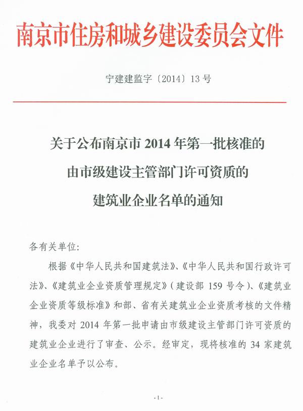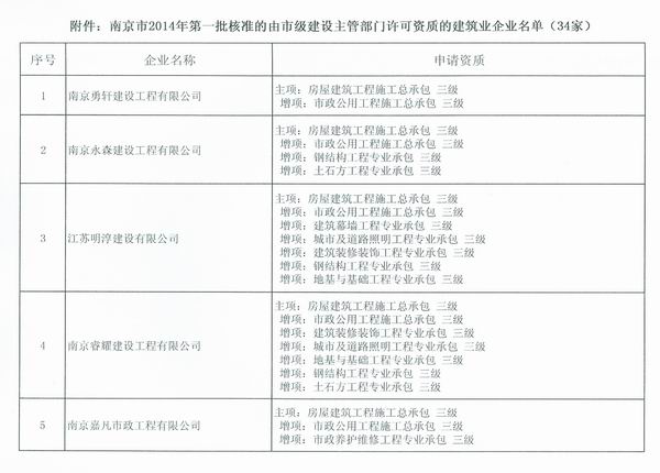 關(guān)于公布南京市2014年第一批核準(zhǔn)的由市級(jí)建設(shè)主管部門(mén)許可資質(zhì)的建筑業(yè)企業(yè)名單的通知