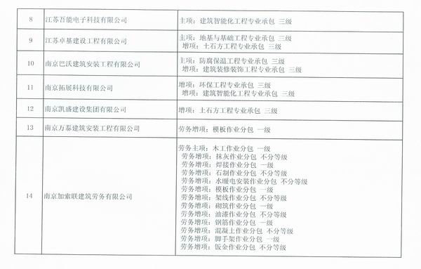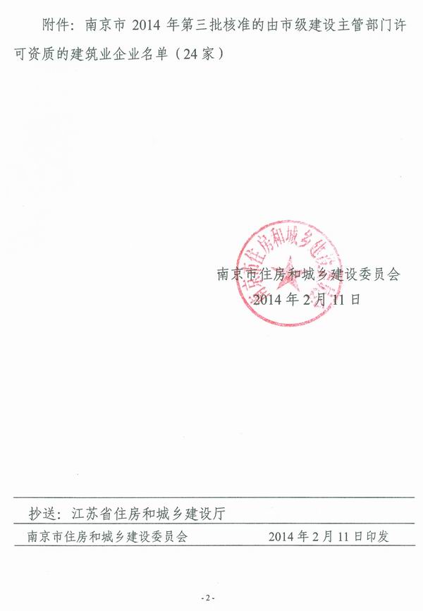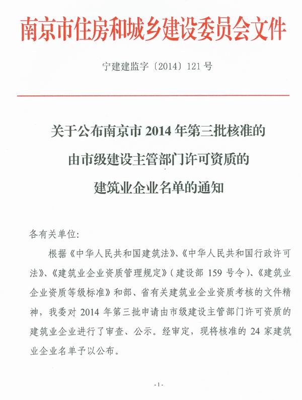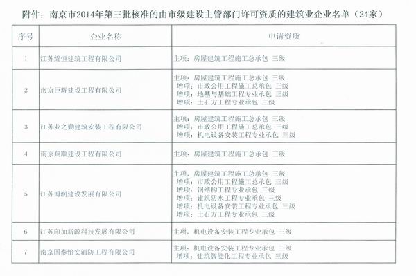 關(guān)于公布南京市2014年第三批核準(zhǔn)的由市級(jí)建設(shè)主管部門許可資質(zhì)的建筑業(yè)企業(yè)名單的通知