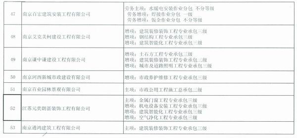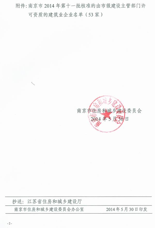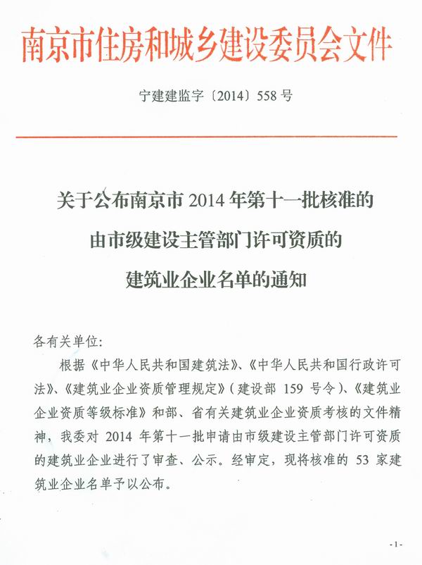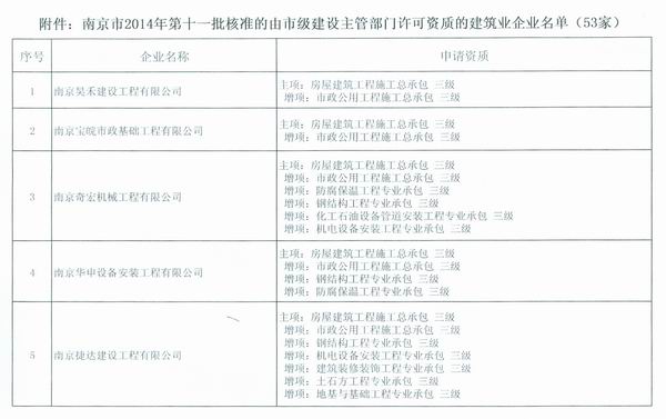 關(guān)于公布南京市2014年第是一批核準(zhǔn)的由市級(jí)建設(shè)主管部門(mén)許可資質(zhì)的建筑業(yè)企業(yè)名單的通知