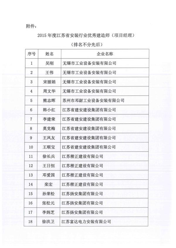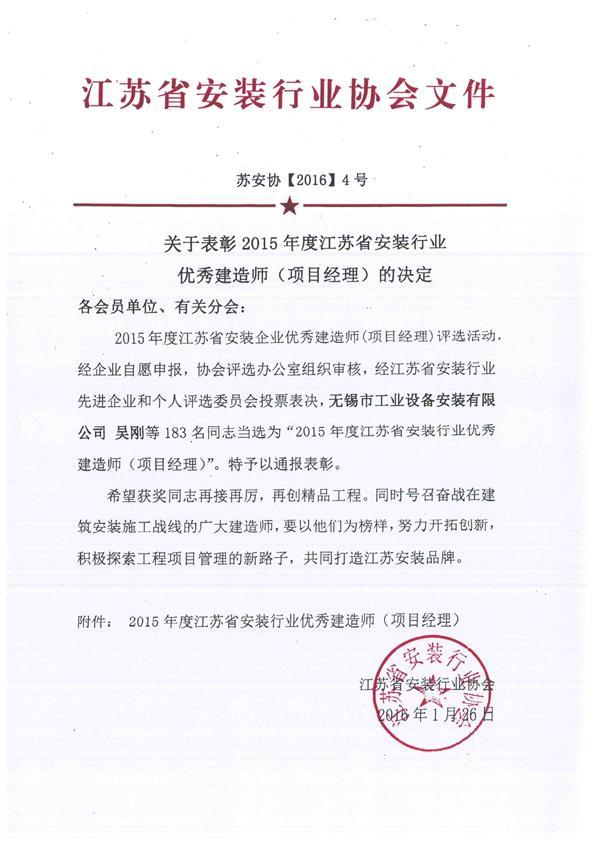 關(guān)于表彰2015年度江蘇省安裝行業(yè)優(yōu)秀建造師(項(xiàng)目經(jīng)理)的決定