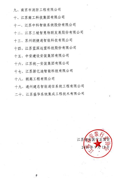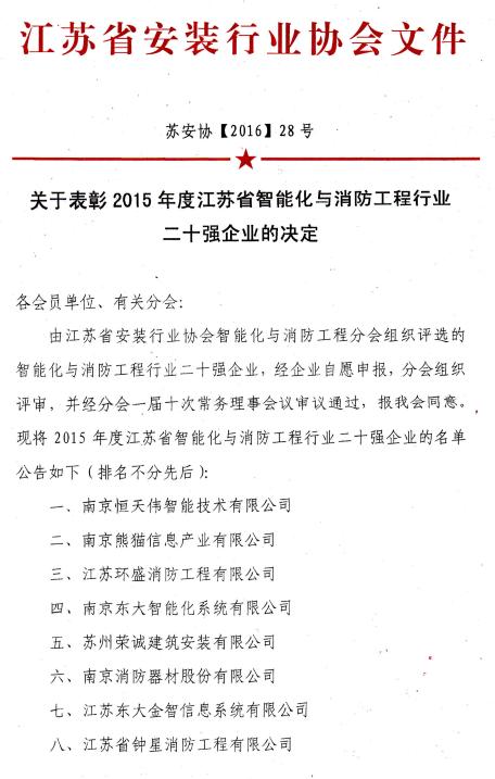 關(guān)于表彰2015年度江蘇省智能化與消防工程行業(yè)二十強(qiáng)企業(yè)的決定